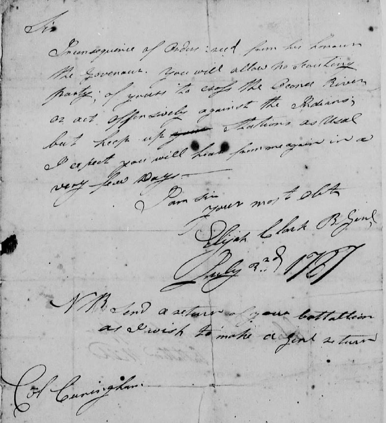 Orders from Brigadier General Elijah Clarke to Colonel John Cunningham advising him to restrict his scouts to stay below the Oconee River and to not "act offensively against the Indians" but to keep up stations as usual. Circa 1787.