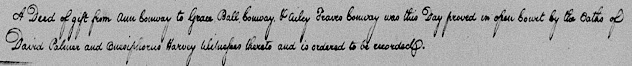 According to researcher Edmund A. Bator [8], our Nancy Conway was an orphan and her guardian was John Gordon. Mr. Bator may be correct; However, there is no proof that the Nancy Conway who had John Gordon as her guardian is our Nancy Conway. The Nancy Conway he refers to is the Nancy Conway who was the daughter of George Conway and Elizabeth Smith. Mr. Bator has also confused this George Conway with the George Conway who was the grandson of Col. Edwin Conway (1681-1763).