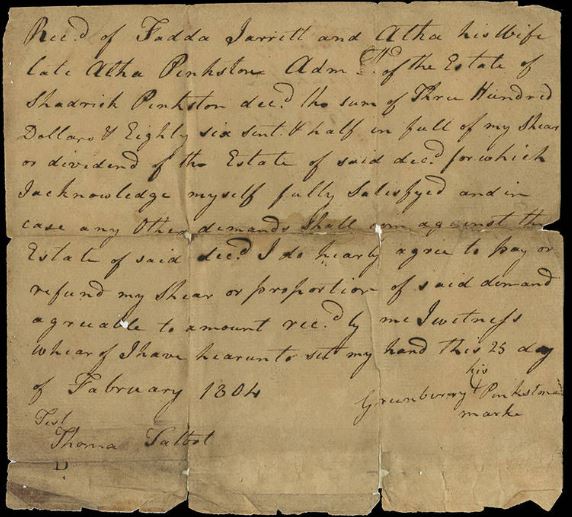 "Rec'd of Shadrack Pinkston, adm. of Greenberry Pinkston, dec'd, Two Dollars for selling (?) land and negroes in the Town of Washington on the first Tuesday in January 1830. John Burl...(?) Sheriff"