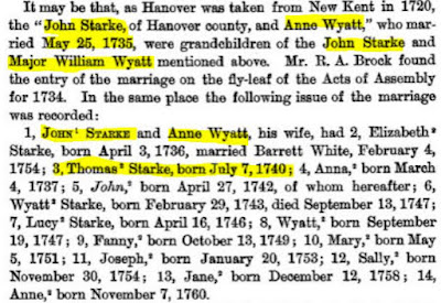 The author's proven ancestor, Mary Starke, who married Stephen Staples, appears to be the daughter of Thomas Starke of Virginia, son of Colonel John Starke and Anne Wyatt.